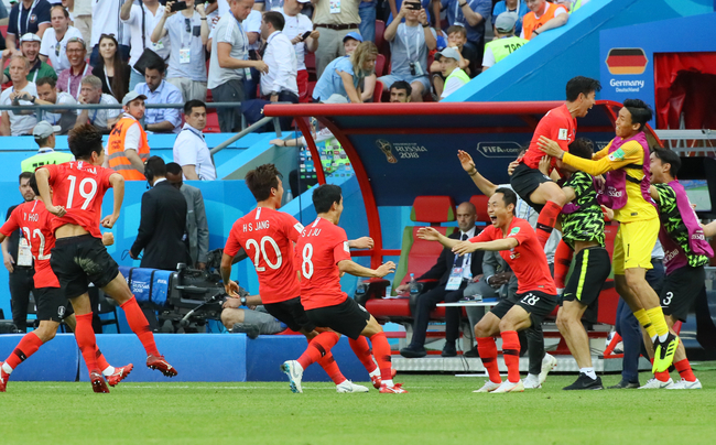 축구대표팀이 27일 (한국시간) 러시아 카잔 아레나에서에서 열린 2018 러시아 월드컵 F조 조별리그 3차전 독일과의 경기에서 골을 넣은 후 기뻐하고 있다.