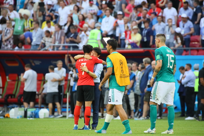 축구대표팀 손흥민과 신태용 감독이 27일(한국시간) 러시아 카잔 아레나에서에서 열린 2018 러시아 월드컵 F조 조별리그 3차전 독일과의 경기에서 2-0으로 승리한 후 포옹하고 있다.