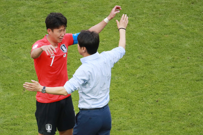 축구대표팀 손흥민과 신태용 감독이 27일(한국시간) 러시아 카잔 아레나에서에서 열린 2018 러시아 월드컵 F조 조별리그 3차전 독일과의 경기에서 2-0으로 승리한 후 포옹하고 있다.