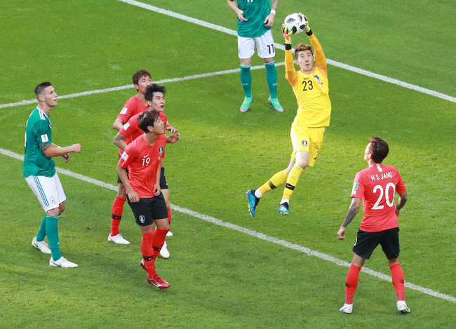 축구대표팀 조현우가 27일(한국시간) 러시아 카잔 아레나에서에서 열린 2018 러시아 월드컵 F조 조별리그 3차전 독일과의 경기에서 상대의 슛을 막고 있다.