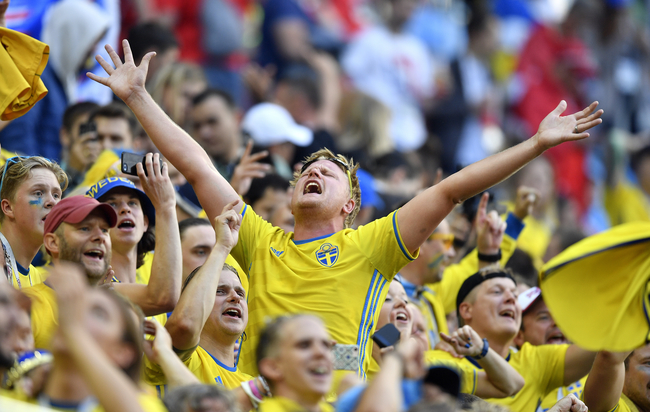 스웨덴이 3일(한국시간) 러시아 상트페테르부르크 아레나에서 열린 2018 러시아 월드컵 16강 스위스와 경기서 에밀 포르스베리의 결승골에 힘입어 1-0으로 승리했다. 경기장을 찾은 스웨덴 팬들이 기뻐하고 있다.