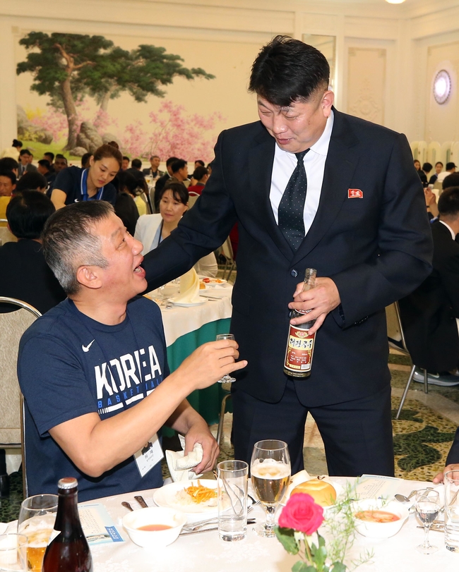 3일 오후 평양 옥류관에서 열린 남북통일농구경기 환영만찬에서 허재 감독과 북측 관계자가 대화를 나누고 있다.