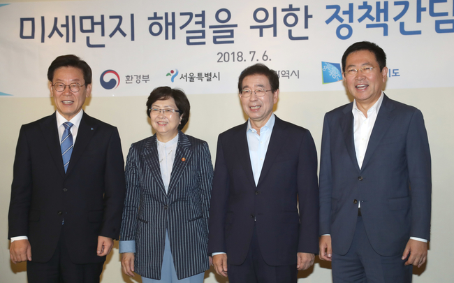 6일 오전 서울 중구 달개비에서 열린 '미세먼지 해결을 위한 정책간담회'에서 이재명 경기도 지사, 김은경 환경부 장관, 박원순 서울 시장, 박남춘 인천 시장이 기념촬영을 하고 있다.