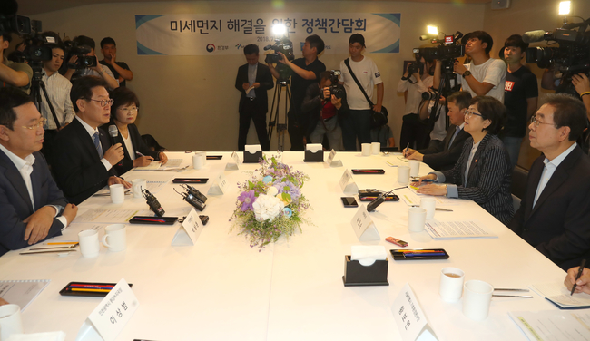 6일 오전 서울 중구 달개비에서 열린 '수도권 광역자치단체장과 환경부의 미세먼지 해결을 위한 정책간담회'에서 이재명 경기도 지사가 인사말을 하고 있다.