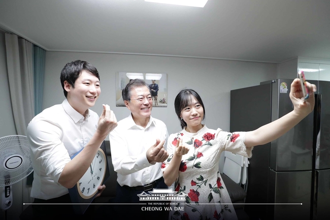 문재인 대통령이 5일 서울 구로구 오류동 행복주택 단지에 입주한 신혼부부 집을 방문해 기념촬영을 하고 있다.