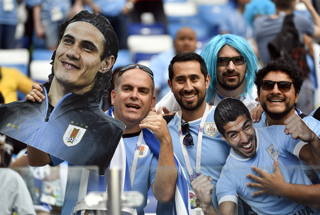 6일(현지시간) 프랑스와 우루과이의 2018 러시아 월드컵 8강전이 열리는 니즈니 노브고로드 스타디움에서 우루과이 축구팬이 에딘손 카마니의 마스크를 들고 응원하고 있다.