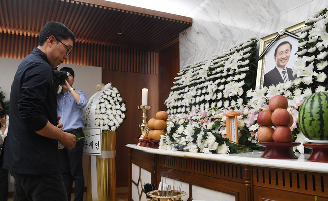 방송인 김제동이 24일 서울 서대문구 연세대 세브란스병원 장례식장에 마련된 고 노회찬 정의당 원내대표의 빈소를 찾아 조문하고 있다.