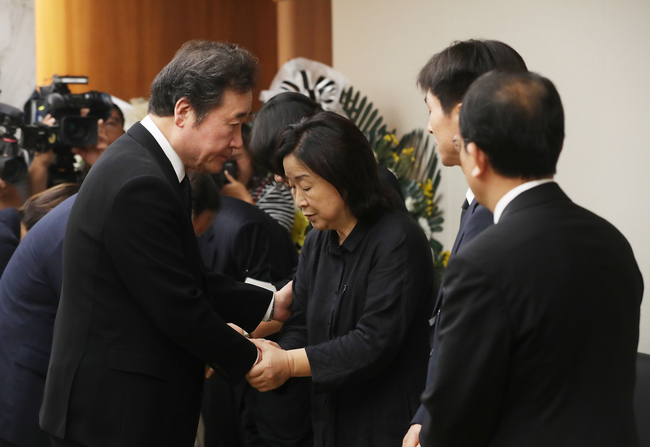 이낙연 국무총리가 26일 서울 신촌 세브란스병원에 마련된 고 노회찬 정의당 원내대표의 빈소를 조문하고 있다.