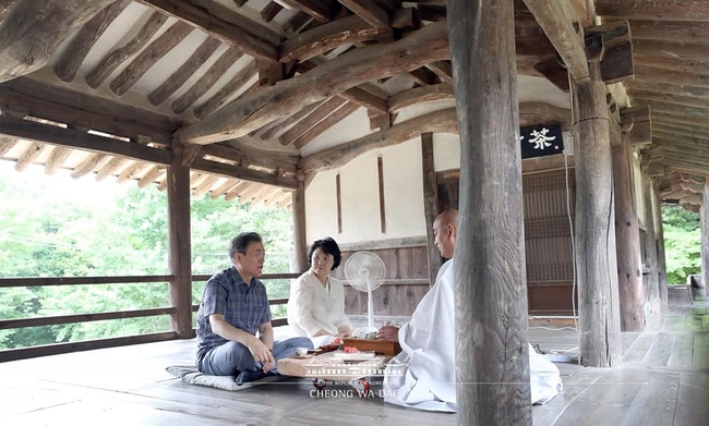문재인 대통령이 28일 유네스코에 등록된 안동 봉정사를 찾아 주지 자현스님과 이야기를 나누고 있다.