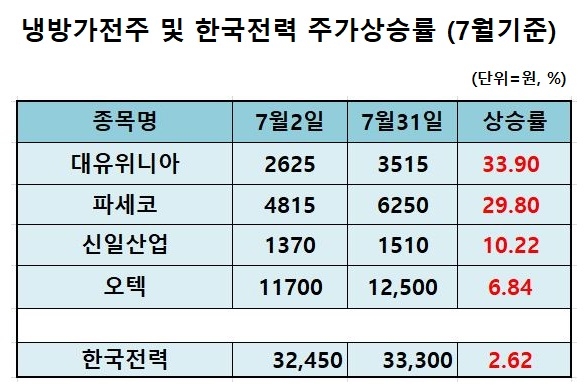 선풍기, 에어서큘레이터(공기순환기) 등을 판매하는 파세코의 주가도 상승곡선을 탔다. 7월 초 4800원대를 유지하던 파세코는 7월 말 6200원대로 마감하며 29%까지 큰 폭 뛰었다.