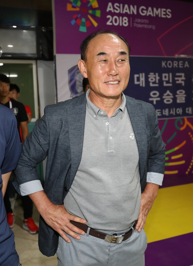 2018 자카르타·팔렘방 아시안게임에 출전하는 23세 이하(U-23) 남자 축구대표팀 김학범 감독이 12일(현지시간) 새벽 인도네시아 자카르타 수카르노 하타 국제공항에 도착해 차량으로 이동하고 있다.