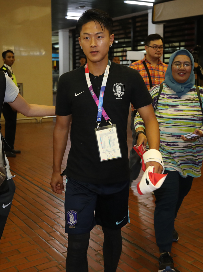 2018 자카르타·팔렘방 아시안게임에 출전하는 23세 이하(U-23) 남자 축구대표팀 이승우가 12일(현지시간) 새벽 인도네시아 자카르타 수카르노 하타 국제공항에 도착해 차량으로 이동하고 있다.