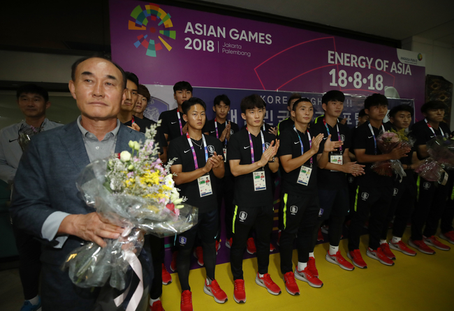 2018 자카르타·팔렘방 아시안게임에 출전하는 23세 이하(U-23) 남자 축구대표팀이 12일(현지시간) 새벽 인도네시아 자카르타 수카르노 하타 국제공항에 도착해 기념촬영을 하고 있다.