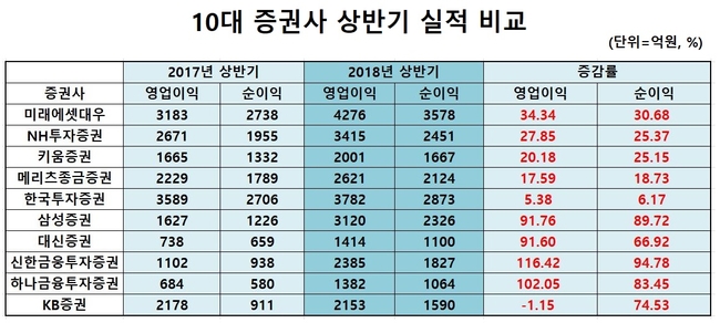 17일 한국거래소에 따르면 국내 10대 증권사 모두 올해 상반기 호실적을 냈다. 특히 신한금융투자증권과 하나금융투자증권은 지난해 대비 이익 규모가 2배 늘어나는 기염을 토했다.