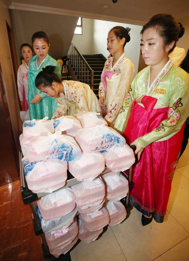 제21차 이산가족 상봉행사 1회차 둘째날인 21일 외금강호텔에서 열린 개별상봉 행사에서 중식을 위해 북측 접대원들이 도시락을 가족들에게 전달하고 있다.