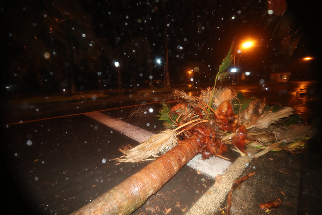 제주도 전역에 태풍경보가 내려진 22일 서귀포시 중문관광단지 내 도로 가에 심어진 야자수가 강풍에 쓰러져 있다.