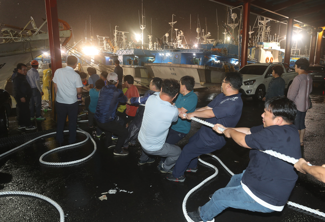 제주도 전역에 태풍경보가 내려진 22일 서귀포항에서 어민들이 배들을 단단히 고정하기 위해 힘을 모아 로프를 당기고 있다.