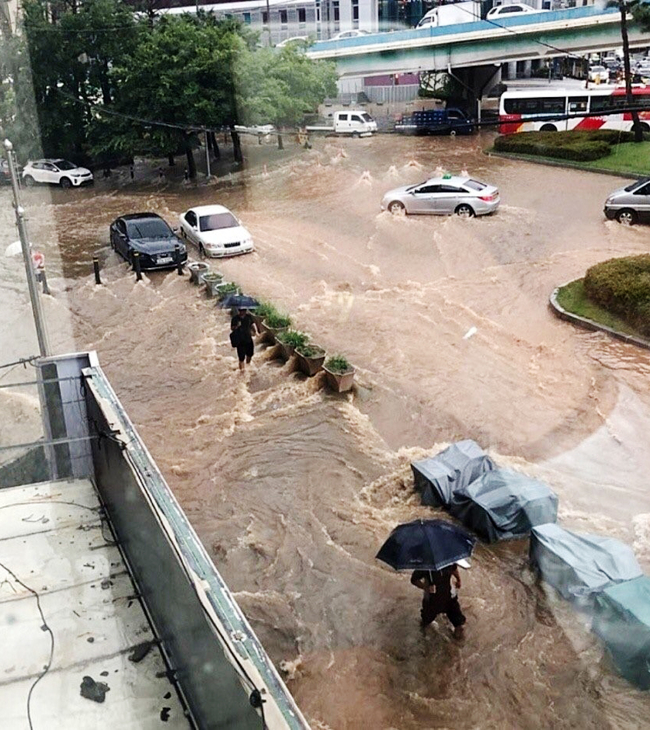27일 오전 광주 남구 백운동 일대가 시간당 60㎜ 이상 쏟아진 국지성 호우로 물에 잠겨 있다.