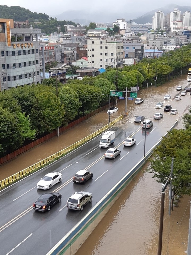 27일 오전 광주 남구 백운동 일대가 시간당 60㎜ 이상 쏟아진 국지성 호우로 물에 잠겨 있다.