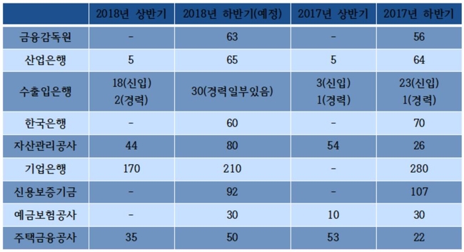 금융감독원, 한국은행, KDB산업은행, 예금보험공사 등 공공 분야의 주요 금융기관들이 하반기 신입직원 채용에 나섰다. 이들 9개 기관의 하반기 채용 규모는 지난해 하반기보다 소폭 늘었다.