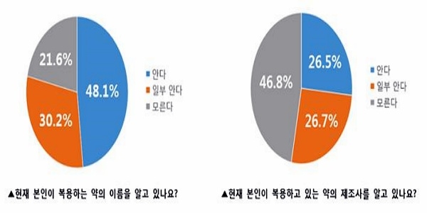 또 정기적으로 약을 복용하고 있는 응답자 중 ‘현재 본인이 복용하는 약의 이름을 알고 있는가’에 대해서는 48.1%(247명)가 ‘안다’고 응답했다. ‘제조사를 알고 있는가’에 대해서는 46.8%(240명)가 ‘모른다’고 응답해 ‘약의 제품명’보다 ‘제조사’에 대한 인식이 다소 낮은 것으로 나타났다.