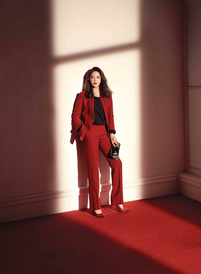 김희선은 이번 화보에서 레드, 체크 등 슈트 패션으로 클래식한 모습을 연출했다.