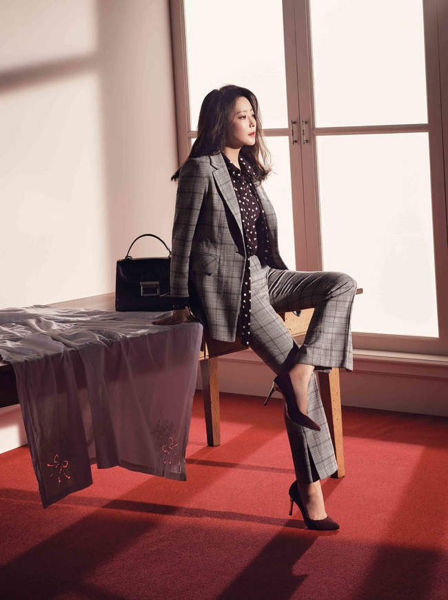 김희선은 이번 화보에서 레드, 체크 등 슈트 패션으로 클래식한 모습을 연출했다.