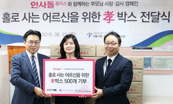 ‘인사돌플러스와 함께하는 부모님 사랑감사 캠페인’은 효(孝)의 가치를 되새기기 위해 동국제약이 2015년부터 4년째 온·〮프라인을 통해 실시하고 있는 사회공헌활동이다. 지난 5월 한달 간 온라인에서 진행한 독거어르신 응원캠페인과 5월19일 부모님께 감사의 손편지를 작성하는 오프라인 행사를 통해 적립된 500개의 ‘효박스’가 이날 기부됐다.