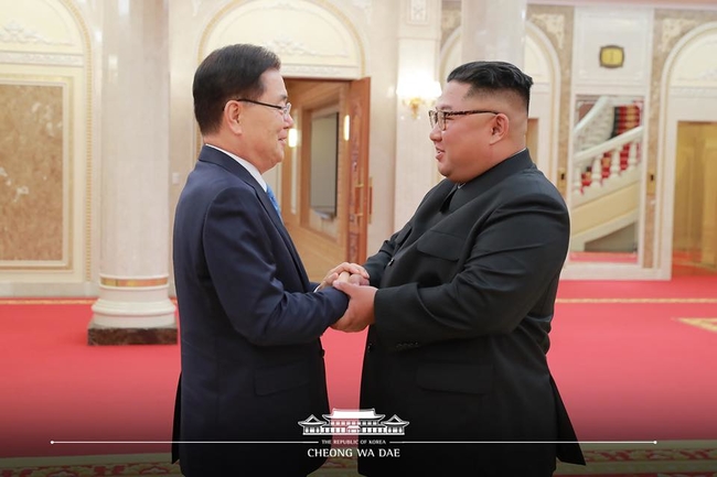 문재인 대통령의 특별 사절단 단장인 정의용 국가안보실장이 5일 북한 평양에서 김정은 북한 국방위원장을 만나 악수하고 있다.