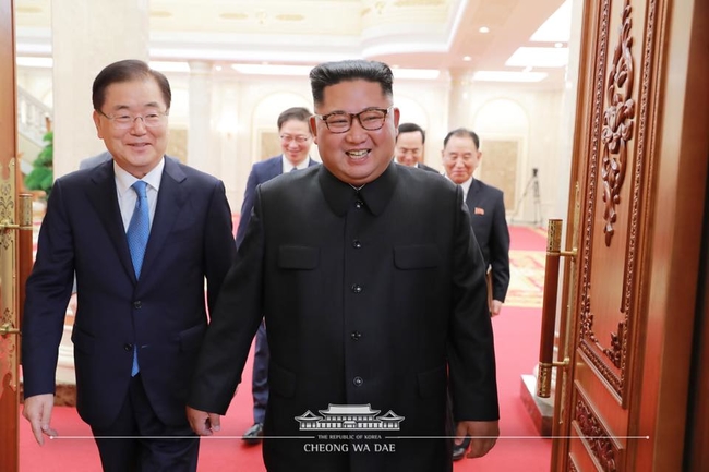 문재인 대통령의 특별 사절단 단장인 정의용 국가안보실장이 5일 북한 평양에서 김정은 북한 국방위원장을 만났다.