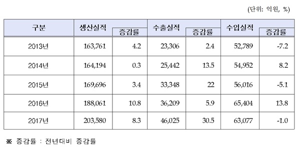 국내 의약품 생산실적은 2017년 20조 3580억원으로 전년 18조 8061억원 대비 8.3% 늘어나 20조원을 처음으로 돌파했다.