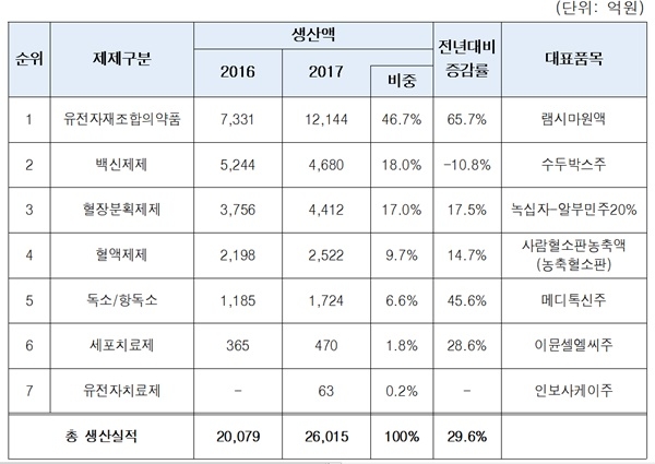 바이오의약품 생산실적은 2조 6015억원으로 전년(2조 79억원) 대비 29.6% 증가했다.