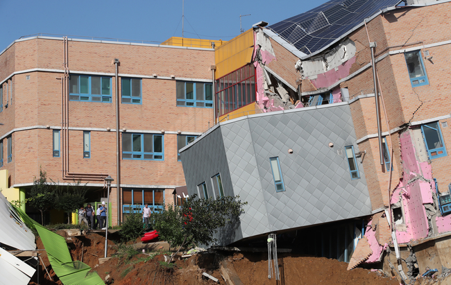 7일 오전 서울 동작구 상도동 다세대주택 공사장의 흙막이가 무너져 근처 상도유치원 건물이 기울어져 위태롭게 서 있다.