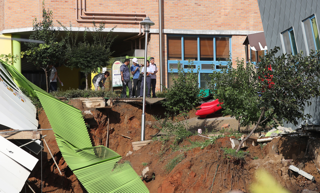 7일 오전 서울 동작구 상도동 다세대주택 공사장의 흙막이가 무너져 근처 상도유치원 건물이 기울어져 위태롭게 서 있다.