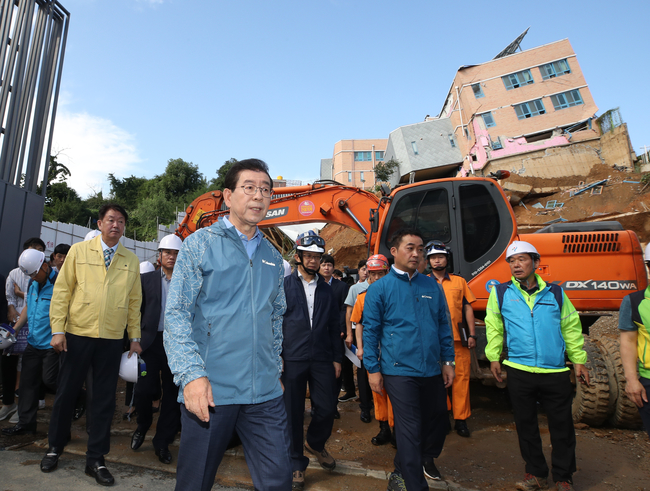 박원순 서울시장이 7일 오전 서울 동작구 상도동 다세대주택 공사장의 흙막이 붕괴현장을 둘러보고 있다.
