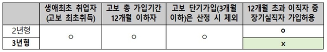3월 15일 일자리대책 일환으로 3년형이 생겨났다. 3년형의 경우 연령, 고용보험 가입 이력, 학력 등 조건이 2년형과 동일하다. 다만 고용보험 총 가입기간이 12개월이 지나면 신청이 불가능하다.