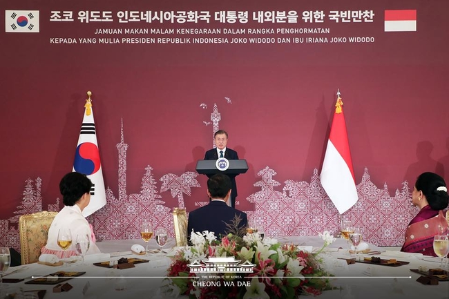 문재인 대통령이 10일 오후 청와대 영빈관에서 열린 조코 위도도 인도네시아 대통령 환영 국빈만찬에서 환영사를 하고 있다.