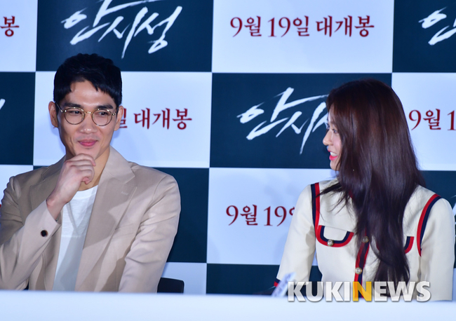 배우 엄태구와 설현이 12일 오후 서울 CGV용산에서 열린 영화 '안시성' (감독 김광식) 언론시사회에서 취재진의 질문에 답하고 있다.