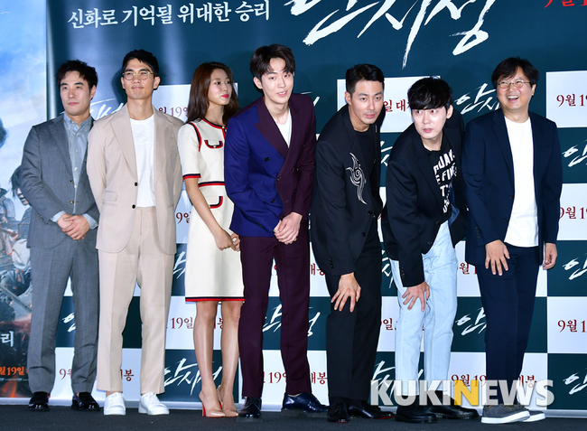 배우 배성우와 엄태구, 설현, 남주혁, 조인성, 박병은, 감독 김광식이 12일 오후 서울 CGV용산에서 열린 영화 '안시성' (감독 김광식) 언론시사회에서 포즈를 취하고 있다.