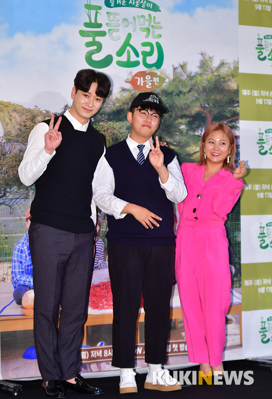 2PM 황찬성, 중딩 농부 한태웅, 개그맨 박나래가 17일 오후 서울 상암동 CJ ENM센터에서 열린 케이블채널 tvN '풀 뜯어먹는 소리 가을편' 제작발표회에 참석해 포즈를 취하고 있다.