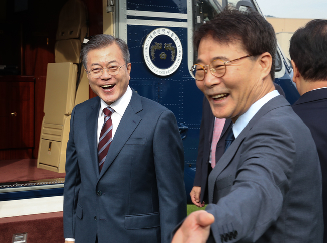 문재인 대통령이 18일 오전 청와대에서 남북정상회담이 열리는 평양으로 향하기 위해 청와대 헬기장에 도착해 전용 헬기에 오르다 직원들과 인사하며 환하게 웃고 있다.