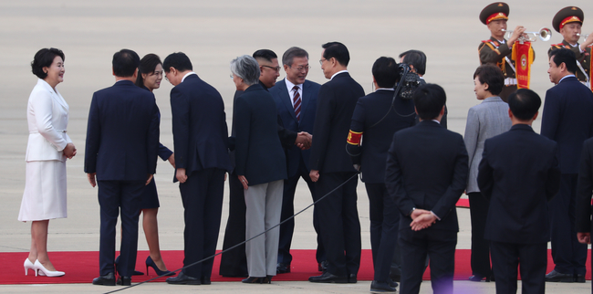 문재인 대통령과 부인 김정숙 여사가 18일 오전 평양 순안공항에 도착해 김정은 국무위원장 내외에게 남측 수행원을 소개하고 있다.