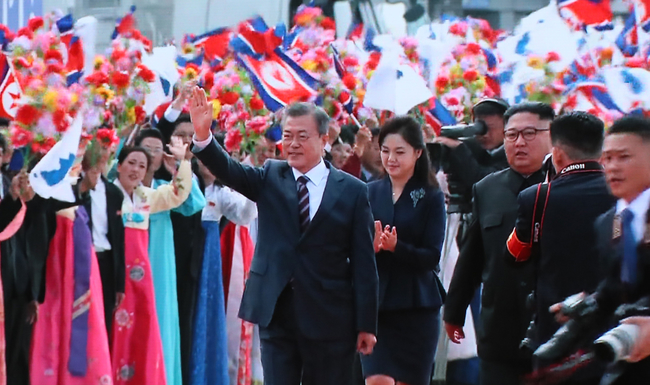 문재인 대통령과 김정은 국무위원장이 18일 오전 평양 순안공항에 도착해 공식환영식장으로 이동하고 있다.