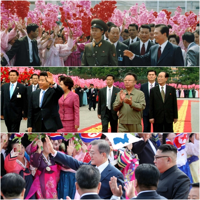 사진 위부터 2000년 6월 평양 순안공항에서 평양시민에 인사하는 김대중 전 대통령과 김정일 전 국방위원장, 2007년 10월 악수하는 노무현 전 대통령과 김정일 전 국방위원장.
