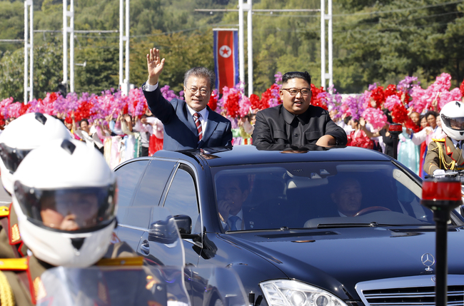 문재인 대통령과 김정은 국무위원장이 무개차를 타고 18일 평양순안공항에서 백화원 초대소로 이동하며 시민들을 향해 인사하고 있다.