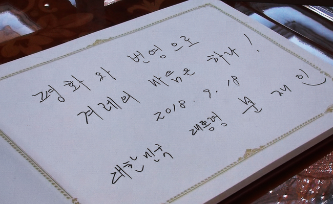 김정은 국무위원장과의 첫 평양 정상회담을 위해 18일 평양 조선노동당 중앙위원회 본부청사를 방문한 문재인 대통령이 작성한 방명록. '평화와 번영으로 겨레의 마음은 하나!'라고 적혀 있다.