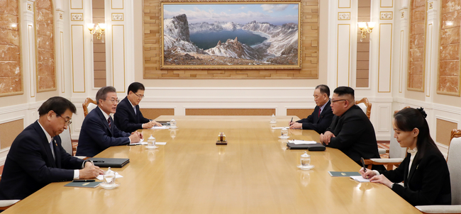문재인 대통령이 18일 오후 평양 조선노동당 중앙위원회 본부 청사에서 김정은 국무위원장과 정상회담을 하고 있다. 앞줄 왼쪽부터 시계방향으로 서훈 국정원장, 문재인 대통령, 정의용 국가안보실장, 김영철 당중앙위 부위원장, 김정은 국무위원장, 김여정 당중앙위 제1부부장.