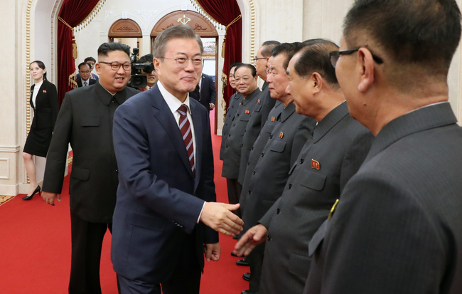 문재인 대통령과 김정은 국무위원장이 18일 오후 정상회담을 갖기 위해 평양 조선노동당 중앙위원회 본부 청사에 들어선 가운데 북측 노동당 간부들과 인사하고 있다.