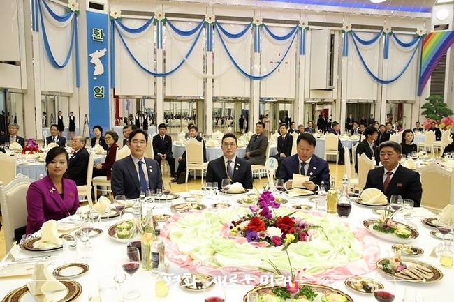 현송월 삼지연관현악단장과 이재용 삼성전자 부회장, 구광모 LG회장, 최태원 SK회장이 18일 오후 평양 목란관에서 열린 남북정상회담 환영 만찬에 참석했다.