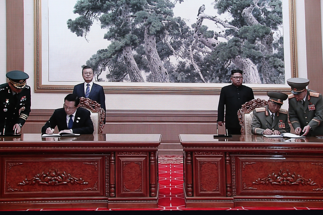 문재인 대통령 평양 방문 이틀째인 19일 오전 평양 백화원 영빈관에서 문재인 대통령과 김정은 국무위원장이 임석한 가운데 송영무 국방부 장관과 노광철 인민무력상이 판문점선언 이행을 위한 군사분야 합의서에 서명하고 있다.